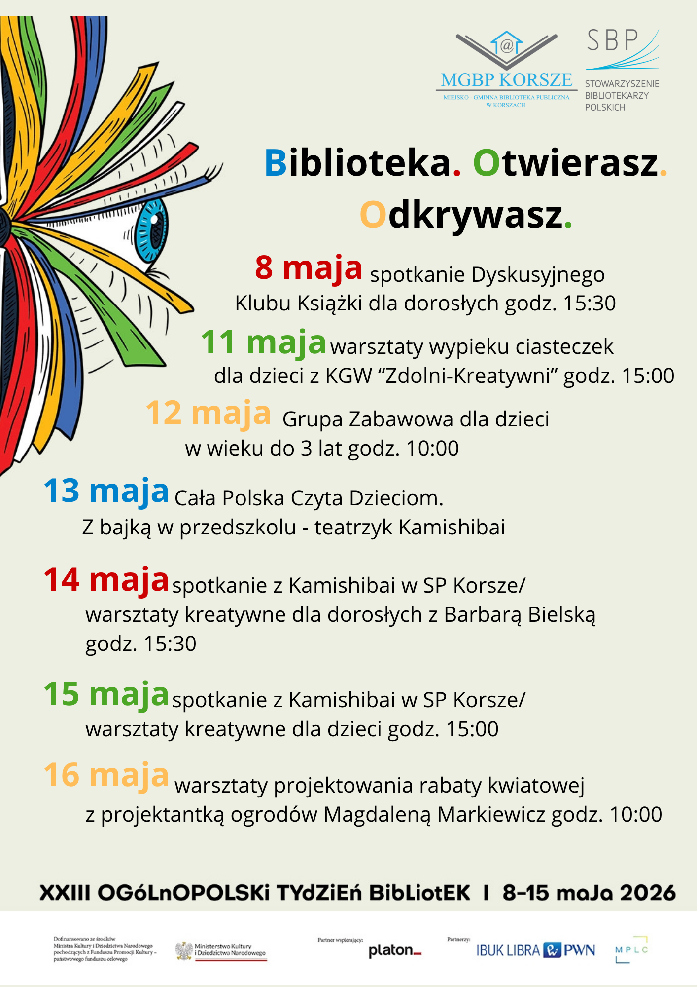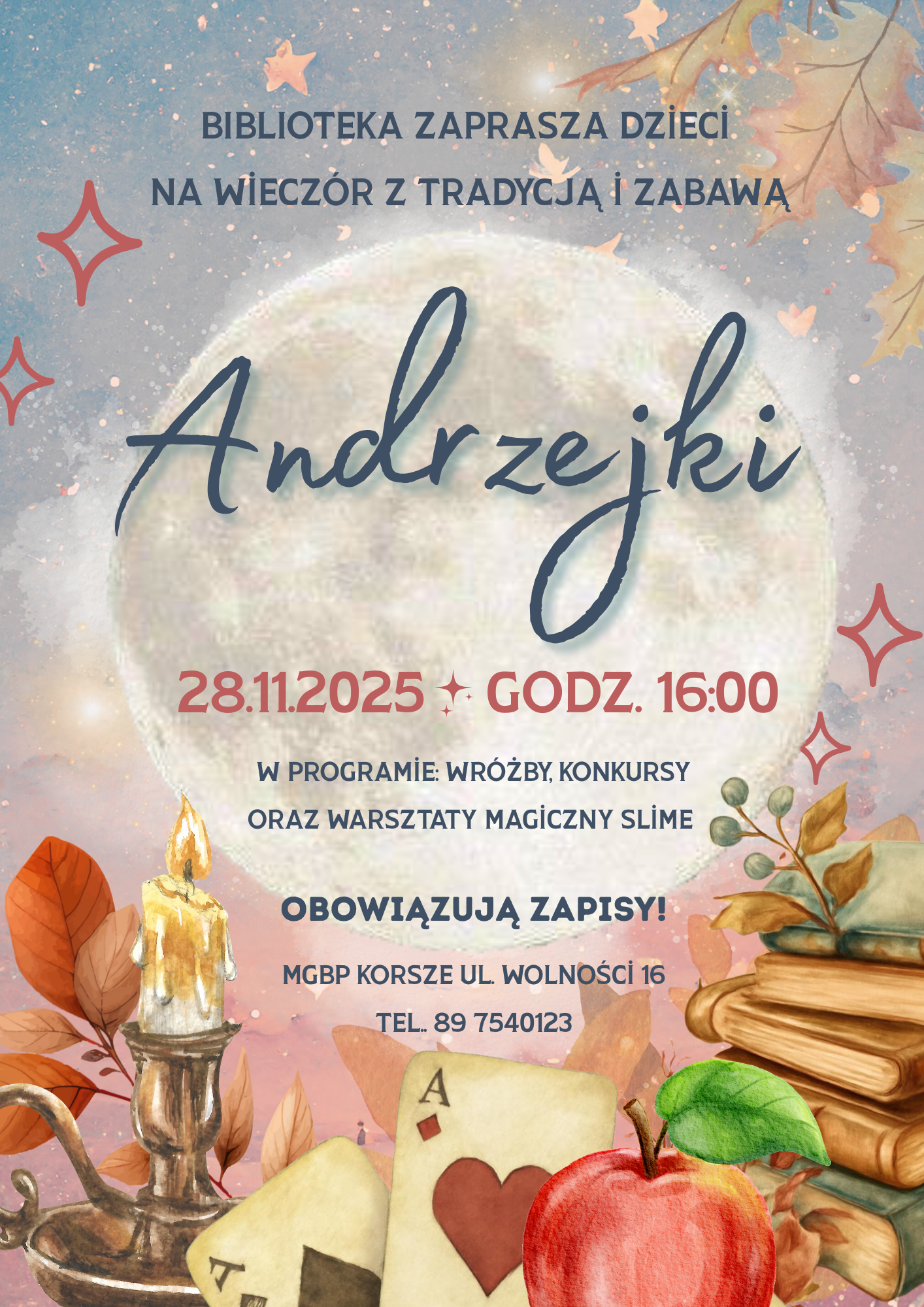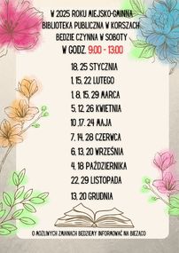 W 2025 r. Miejsko-Gminna Biblioteka Publiczna w Korszach będzie czynna w soboty w godz. 9:00 - 13:00. O możliwych zmianach będziemy informować na bieżąco.