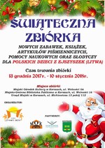 Korszeńskie Stowarzyszenie Społeczno - Kulturalne „Otwarte Drzwi” wspólnie z Gminą Korsze zaprasza wszystkich ludzi dobrego serca do pięknej akcji dobroczynnej „Świąteczna zbiórka zabawek, słodyczy, książek, artykułów piśmienniczych i pomocy naukowych dla Polskich dzieci z Ejszyszek (Litwa)”. Celem akcji jest przygotowanie paczek noworocznych dla dzieci z