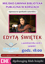 Dnia 6 października Miejsko-Gminna Biblioteka Publiczna w Korszach gościła znaną powieściopisarkę Edytę Świętek, autorkę powieści takich jak: „Noc perseidów”, „Tam, gdzie rodzi się zazdrość”, „Cappuccino z cynamonem”, „Miód na serce”, „Zanim odszedł”, „Cienie przeszłości”, „Spacer Aleją Róż”...