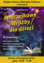 Zapraszamy na Andrzejkowe Wróżby dla dzieci, które odbędą się 30 listopada 2018 r. o godz. 15:00 w Miejsko-Gminnej Bibliotece Publicznej w Korszach. W programie: andrzejkowe wróżby, ciasteczka z przepowiednią, gry i zabawy przy muzyce oraz malowanie twarzy.