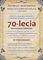 Zapraszamy wszystkich czytelników do wzięcia udziału w konkursie czytelniczym „Wypożycz książkę z niespodzianką” z okazji obchodzonego w 2018 roku 70-lecia powstania biblioteki w Korszach, w którym nagrodą są bony w wysokości 100 zł na zakupy w Księgarni „Książnica Polska”.