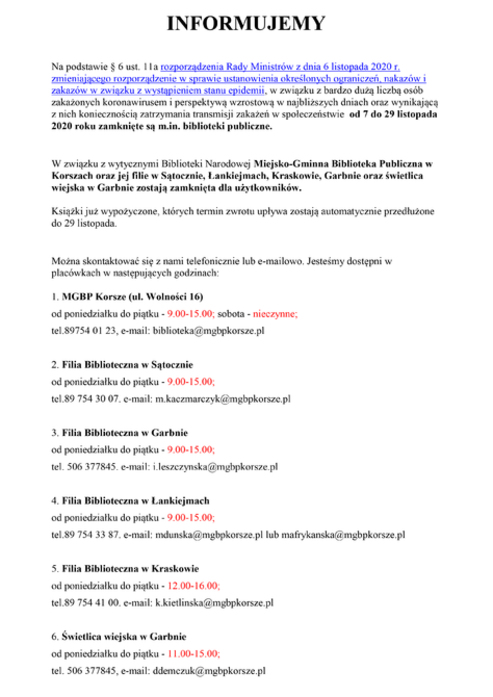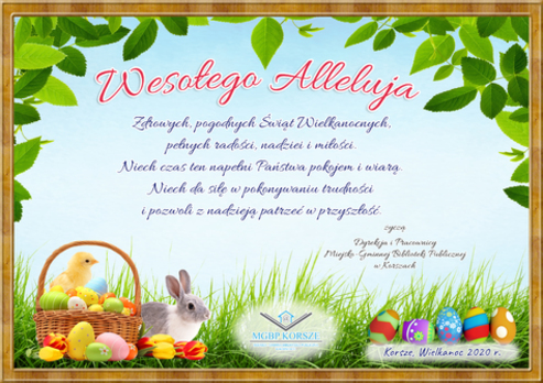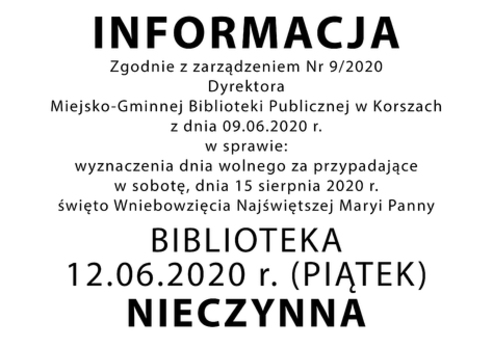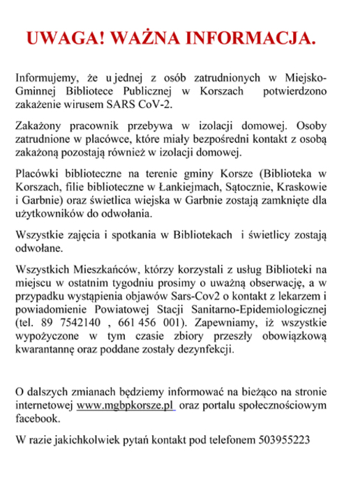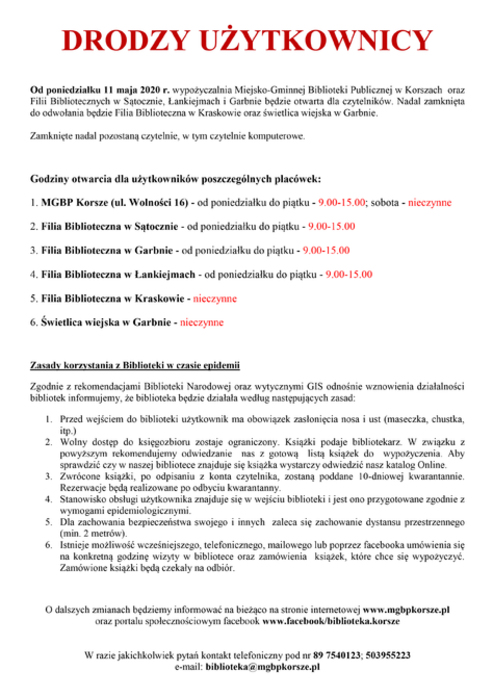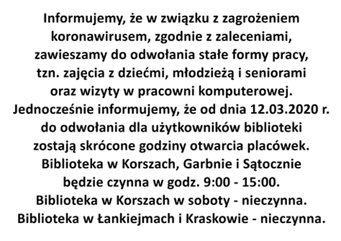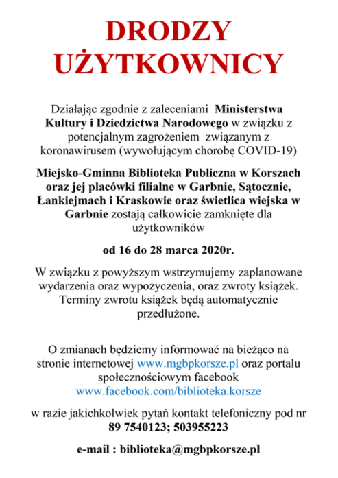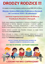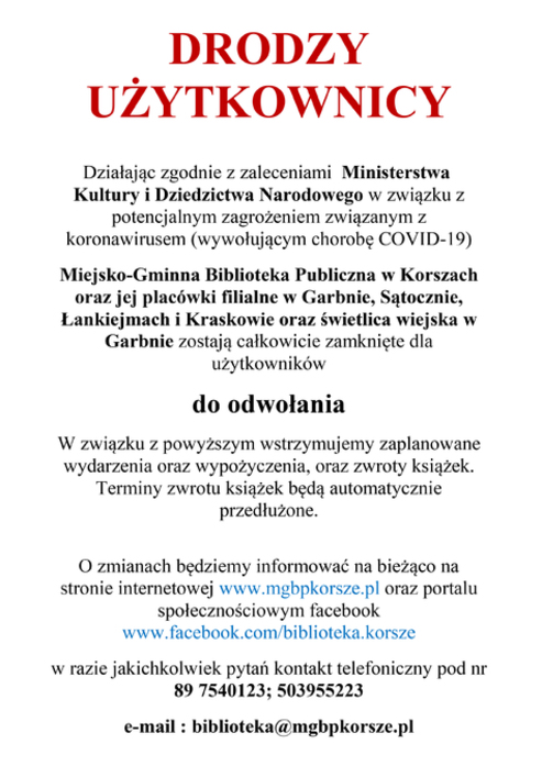 Ze względu na sytuację związaną z epidemią wirusa SARS-COV-2 w Polsce, Miejsko-Gminna Biblioteka Publiczna w Korszach od 1 września 2020 r. do odwołania zawiesza wypożyczanie książek dla dzieci w Przedszkolu Miejskim w Korszach.
