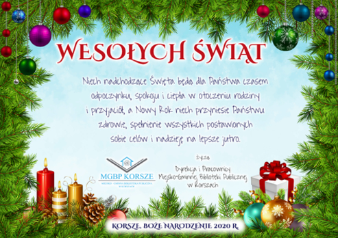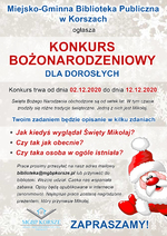 Miejsko-Gminna Biblioteka Publiczna w Korszach ogłasza Konkurs Bożonarodzeniowy dla dorosłych, który trwa od 02.12.2020 r. do 12.12.2020 r.