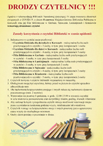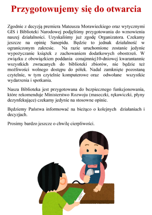 - w wyżej wymienionym reżimie będzie realizowana również usługa „Książka na telefon” gdzie bibliotekarz po wcześniejszym uzgodnieniu z czytelnikiem będzie dostarczał mu zamówione egzemplarze pod drzwi.