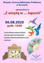 Miejsko-Gminna Biblioteka Publiczna w Korszach zaprasza dzieci na zajęcia „Z wizytą w ... Japonii”, które odbędą się 6 sierpnia 2020 r. o godz. 10:00.