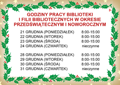 GODZINY PRACY BIBLIOTEKI I FILII BIBLIOTECZNYCH