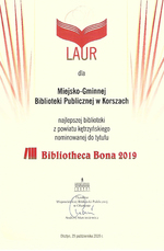 Miejsko-Gminna Biblioteka Publiczna w Korszach otrzymała laur dla najlepszej biblioteki z powiatu kętrzyńskiego nominowanej do tytułu Bibliotheca Bona 2019.