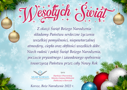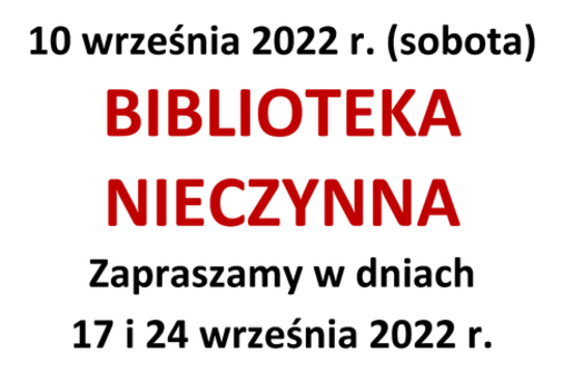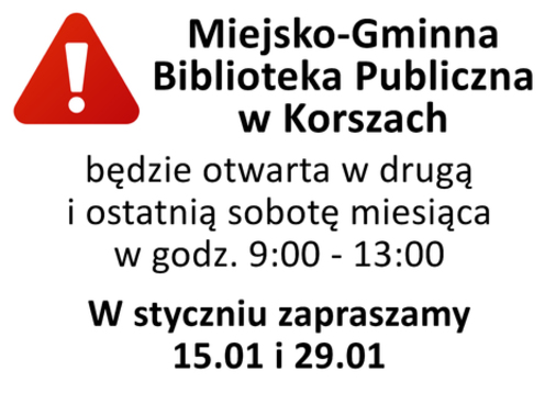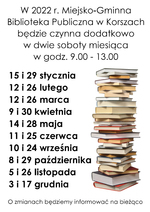 W 2022 r. Miejsko-Gminna Biblioteka Publiczna w Korszach będzie czynna dodatkowo w dwie soboty miesiąca w godz. 9:00 - 13:00. O zmianach będziemy informować na bieżąco.