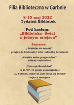 Filia biblioteczna w Garbnie zaprasza na wydarzenia związane z obchodami XIX Ogólnopolskiego Tygodnia Bibliotek pod hasłem „Biblioteka - świat w jednym miejscu”, który odbędzie się w dniach 8-15 maja 2022 r.