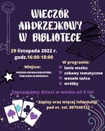 Zapraszamy dzieci w wieku od 6 lat na Wieczór Andrzejkowy w bibliotece, który odbędzie się 29 listopada 2022 r. w godz. 16:00 - 18:00.