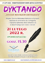 Miejsko-Gminna Biblioteka Publiczna w Korszach zaprasza do zmierzenia się z ortografią i napisania dyktanda, które odbędzie się w dwóch kategoriach: dzieci i dorośli w dniu 21 lutego 2022 r. o godz. 15.30.