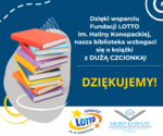 Dziękujemy Fundacji LOTTO im. Haliny Konopackiej za hojną darowiznę! Dzięki wsparciu Fundacji, nasza biblioteka wzbogaci się o książki z dużą czcionką!