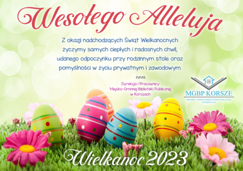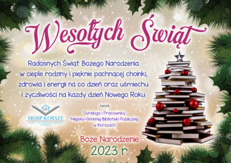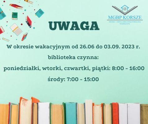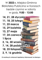 W 2023 r. Miejsko-Gminna Biblioteka Publiczna w Korszach będzie czynna w soboty w godz. 9:00 - 13:00. O możliwych zmianach będziemy informować na bieżąco.