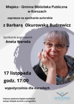 Miejsko-Gminna Biblioteka Publiczna w Korszach zaprasza na spotkanie autorskie z Barbarą Okurowską Budrewicz, które odbędzie się 17 listopada 2023 r. o godz. 17:00.