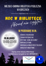 Miejsko-Gminna Biblioteka Publiczna w Korszach, po raz kolejny dołączyła do Ogólnopolskiej Nocy Bibliotek, w tym roku pod hasłem „Absurd nie czytać”. Z tej okazji piątkowy wieczór 13 października spędziliśmy wraz z młodymi czytelnikami...
