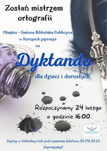 Miejsko-Gminna Biblioteka Publiczna w Korszach zaprasza na dyktando dla dzieci i dorosłych, które odbędzie się 24 lutego o godz. 16:00.