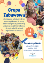 Zapraszamy najmłodsze dzieci wraz z opiekunami do naszej bibliotecznej Grupy Zabawowej. Zajęcia są bezpłatne i odbywać się będą w każdy wtorek w godzinach 10:00 - 12:00.