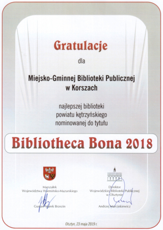 Miejsko-Gminna Biblioteka Publiczna w Korszach po raz pierwszy tytuł Bibliotheca Bona otrzymała już w 2008 roku i był to tytuł przyznany przez Wojewódzką Bibliotekę Publiczną w Olsztynie za szczególne osiągnięcia biblioteki oraz wysokie wskaźniki czytelnictwa.