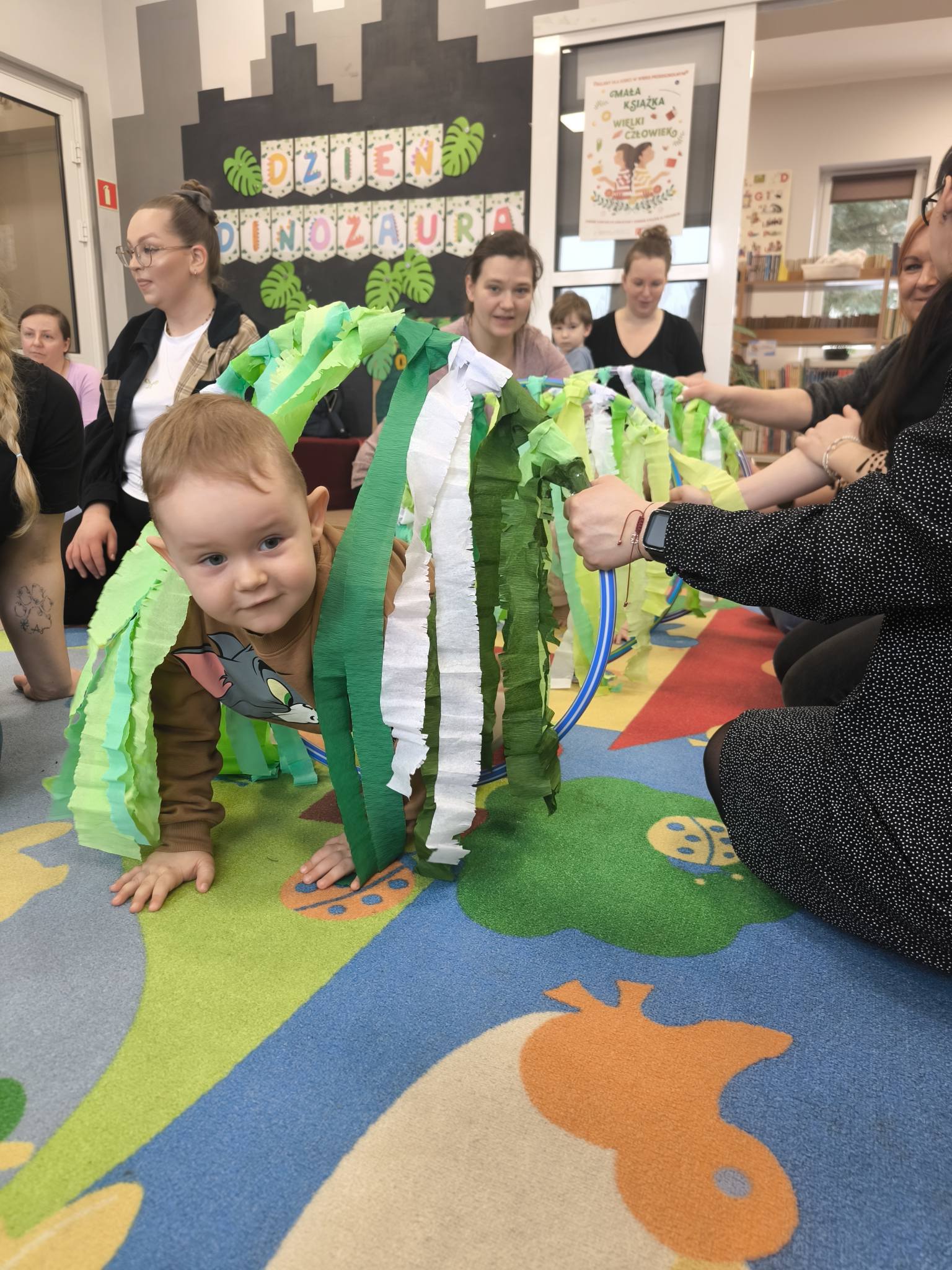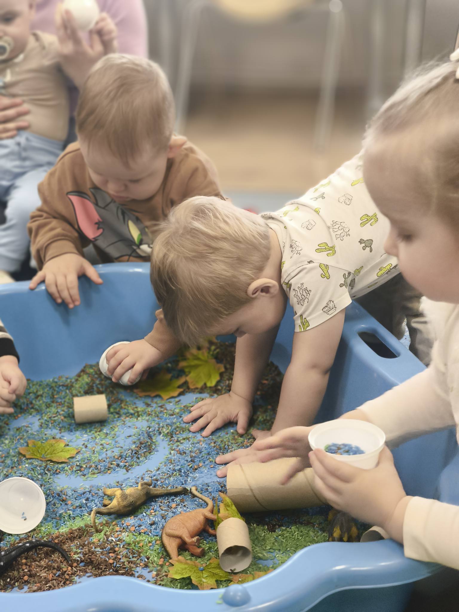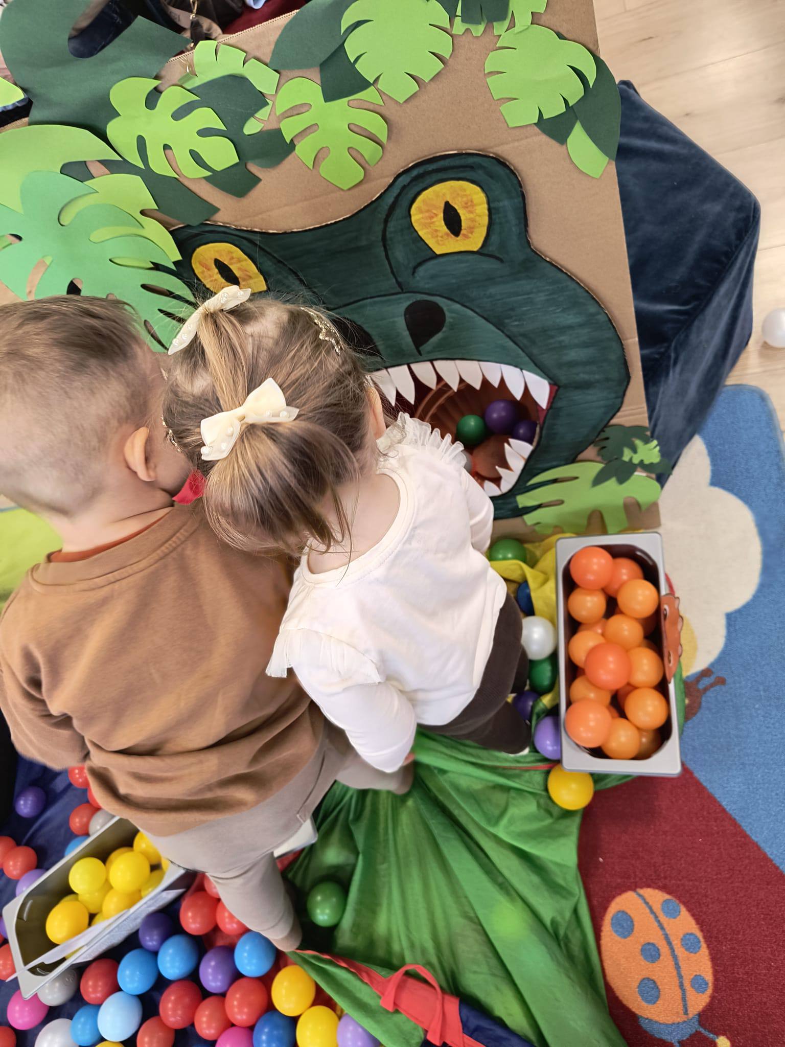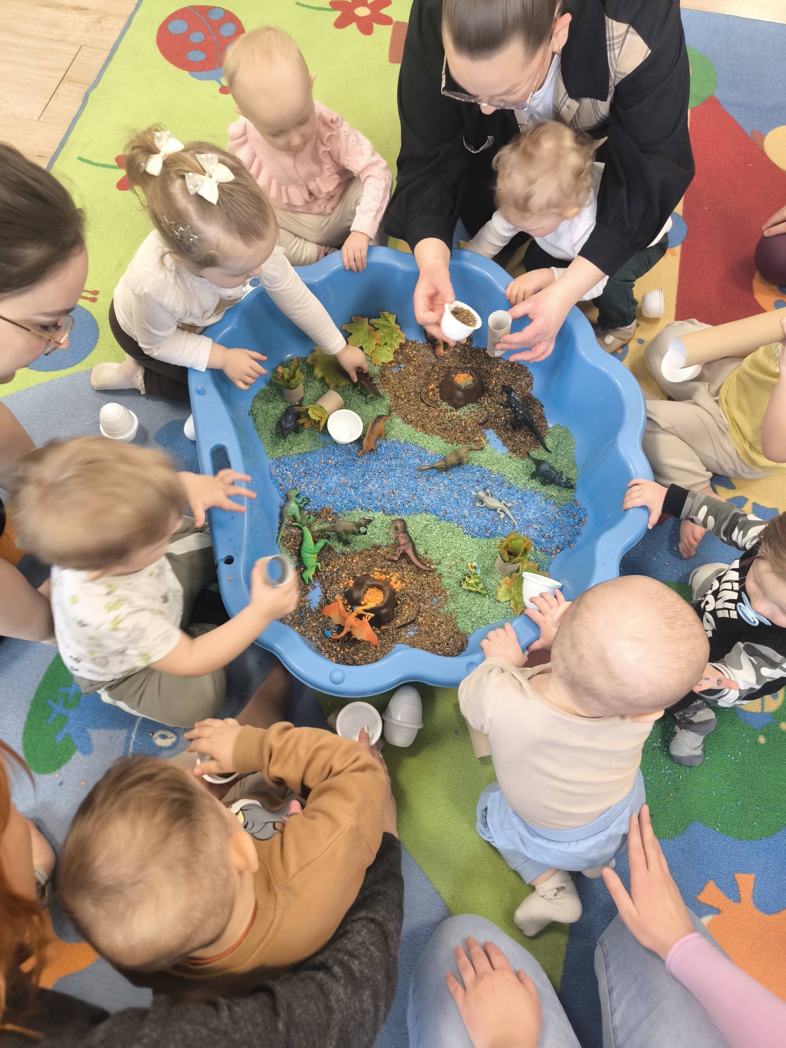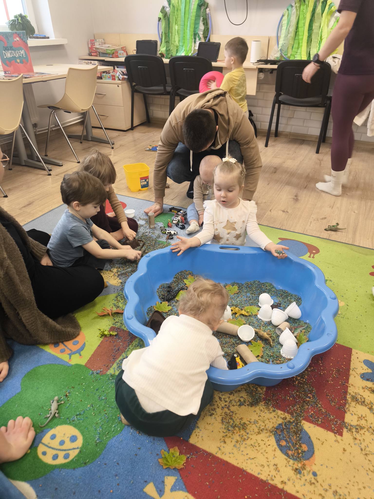Prehistoryczną przygodę rozpoczęliśmy od spotkania grupy zabawowej. Było twórczo, sensorycznie i bardzo radośnie! Powstały błyszczące dinozaury, mali odkrywcy bawili się w krainie z wulkanami, a na zakończenie przemierzali „dżunglę”, odkrywając świat sprzed milionów lat. To był dopiero początek dinozaurowych emocji!