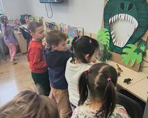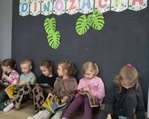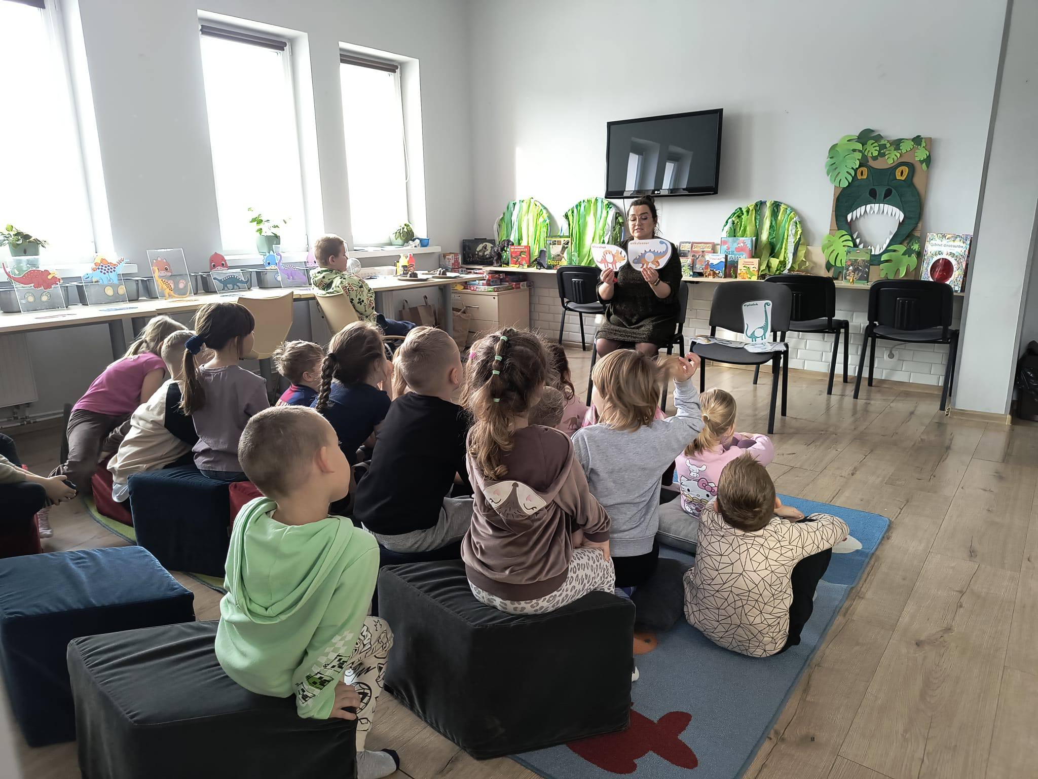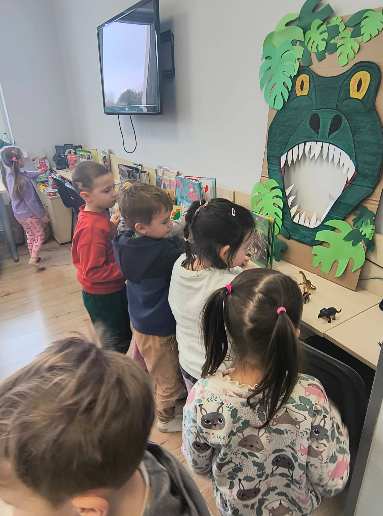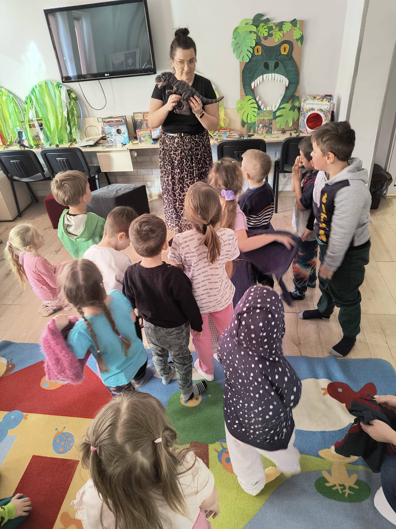 W kolejnych dniach naszą bibliotekę odwiedziły przedszkolaki z lokalnych placówek. Wśród regałów zrobiło się gwarno, radośnie i… bardzo dinozaurowo! Każde spotkanie rozpoczynaliśmy od wspólnego czytania, które przenosiło nas miliony lat wstecz. Rozmawialiśmy o tym, jak wyglądały dinozaury, czym się żywiły i dlaczego wyginęły. Nie brakowało ciekawostek o prehistorycznych gigantach, wspólnego przeglądania książek oraz rozmów, które pokazały, że mali uczestnicy mają imponującą wiedzę.