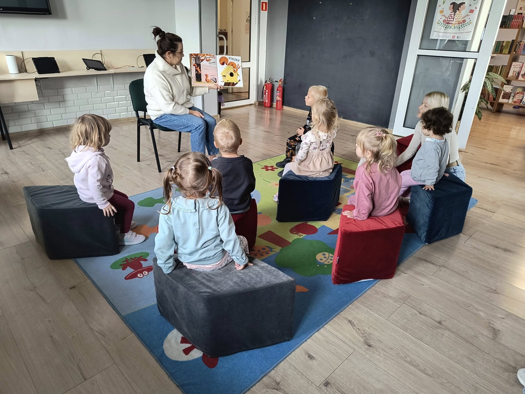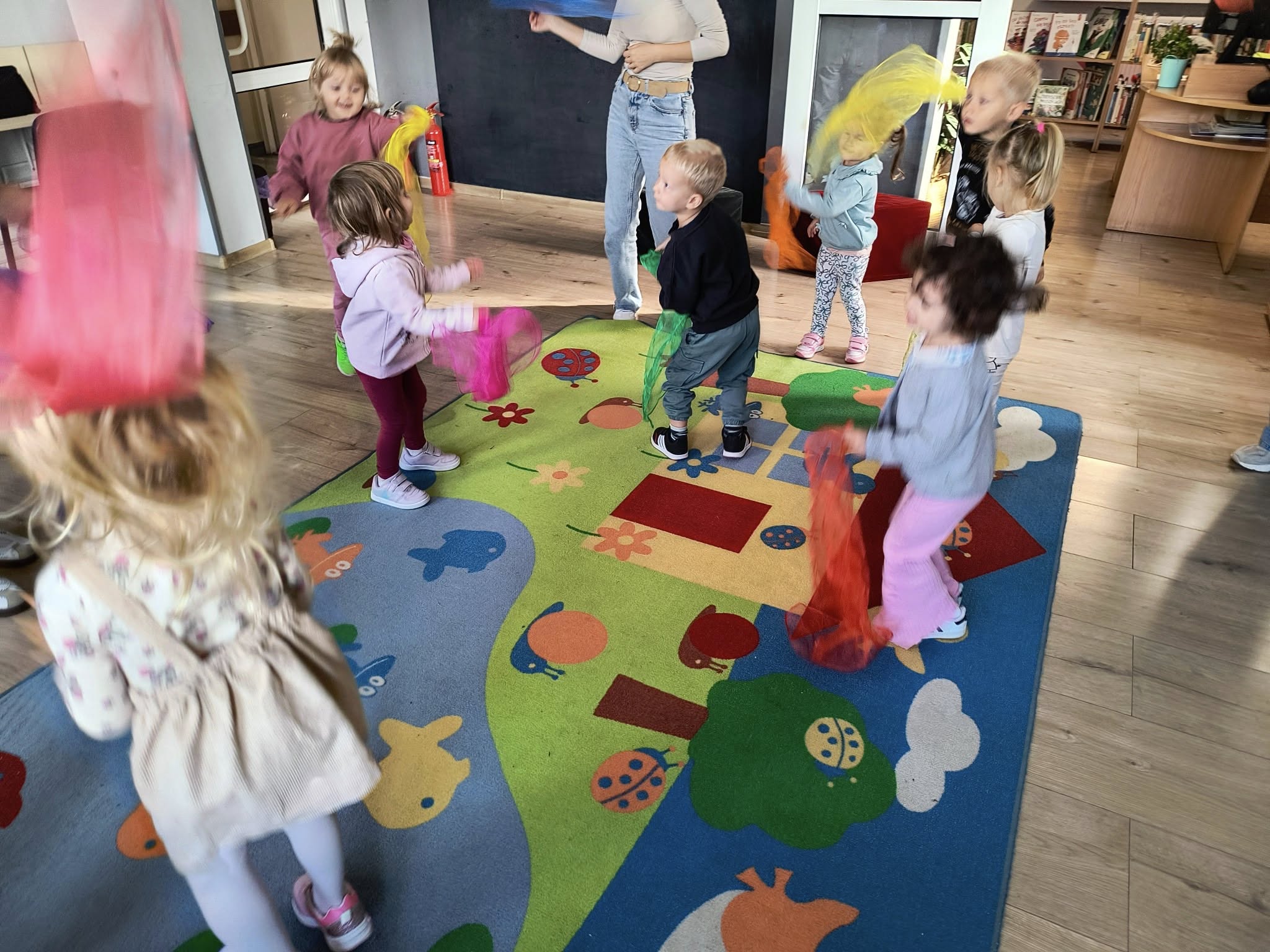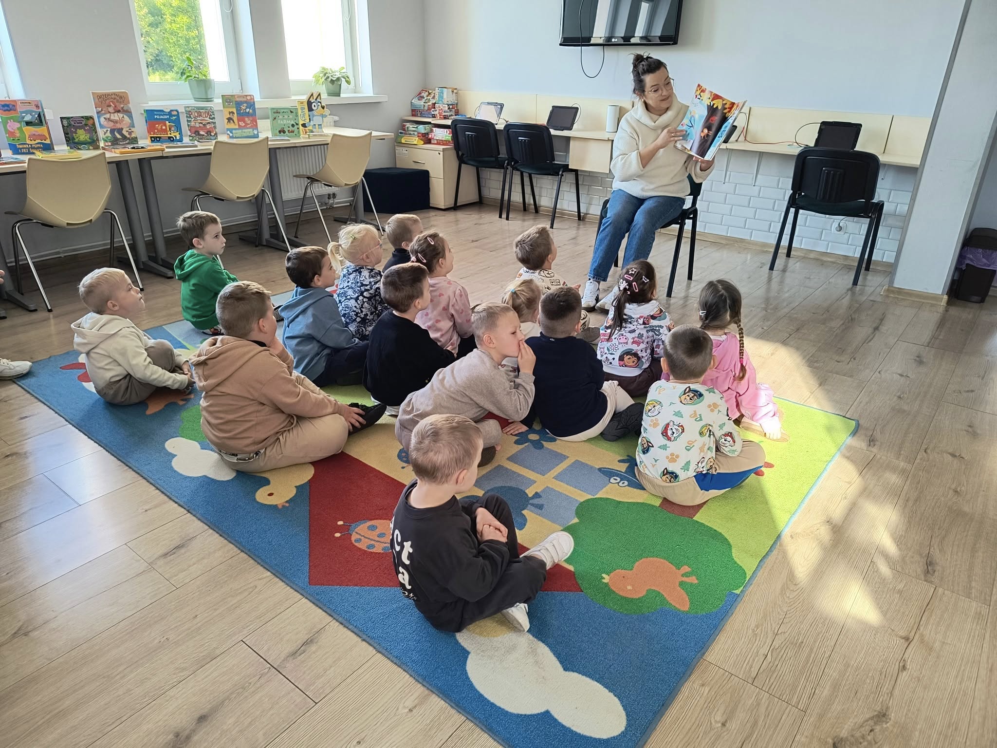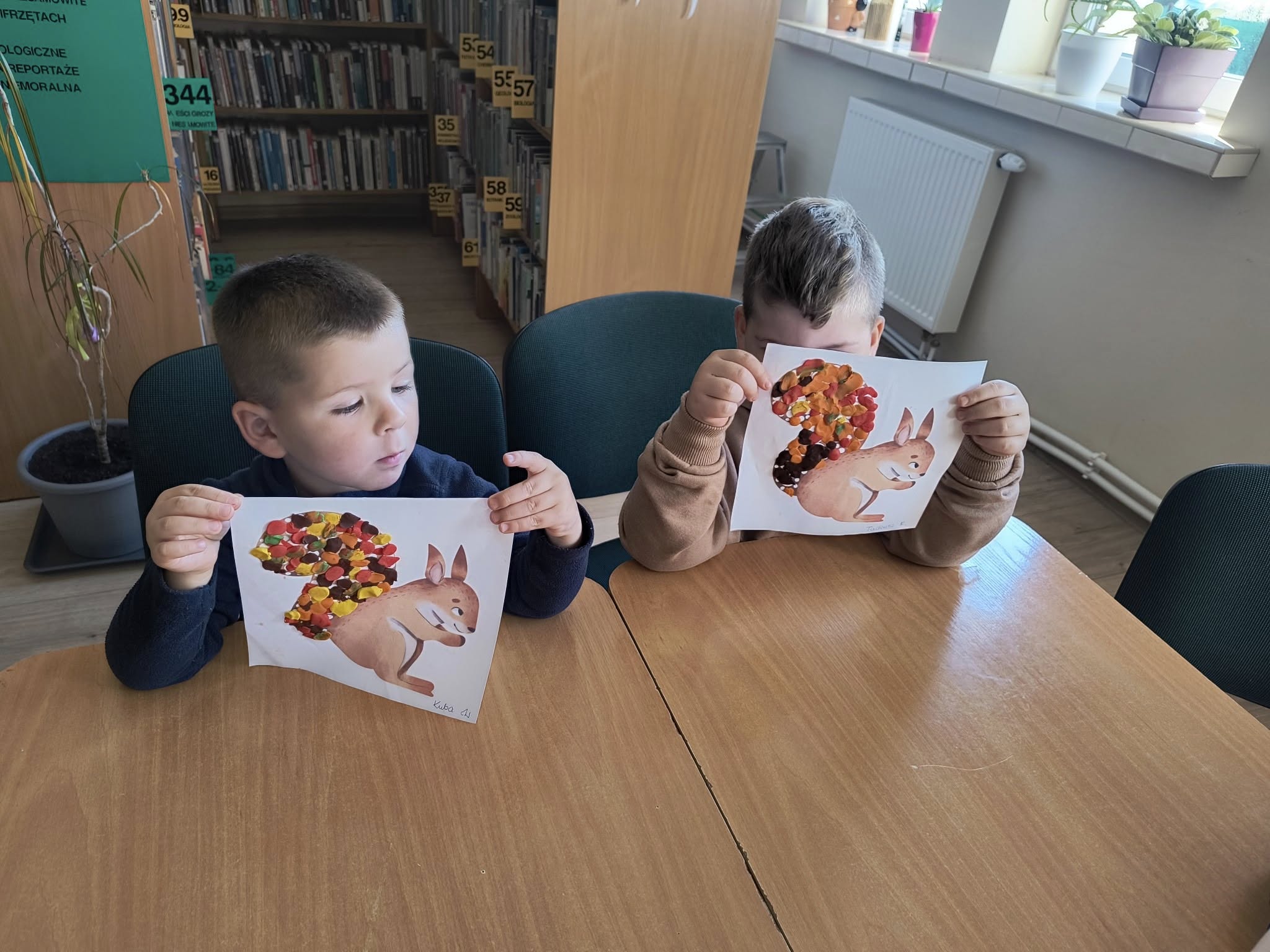 Dzieci słuchały wciągającego opowiadania „Złodziej liści”, a potem bawiły się przy jesiennych zabawachNie zabrakło też kreatywnych zajęć – przedszkolaki wyklejały wiewiórki, ćwicząc zdolności manualneBył to naprawdę miły czas, pełen uśmiechów, kolorowych liści i dobrej zabawy w świecie książek.