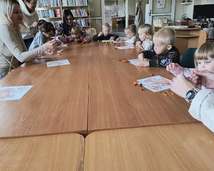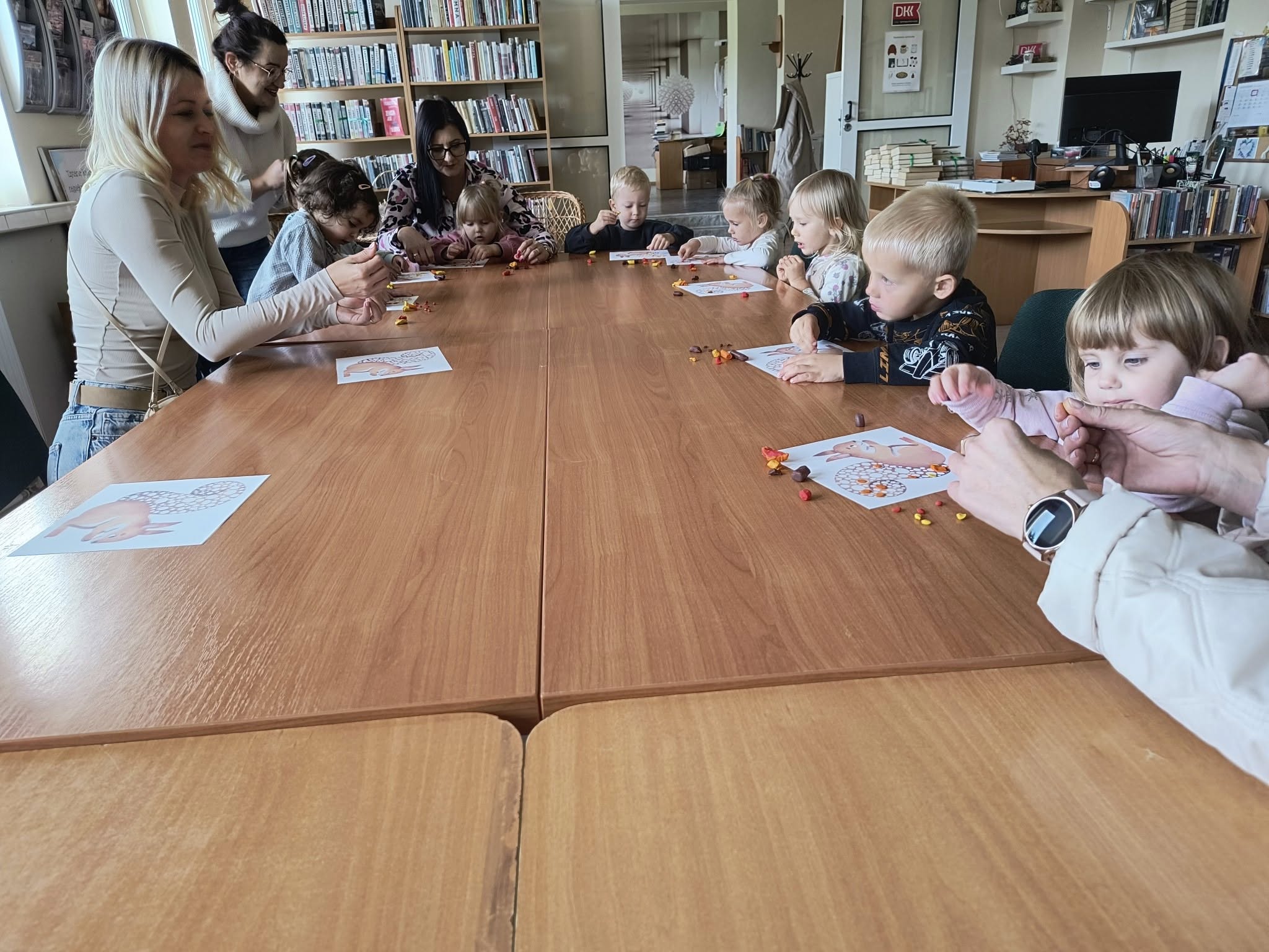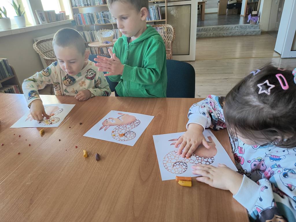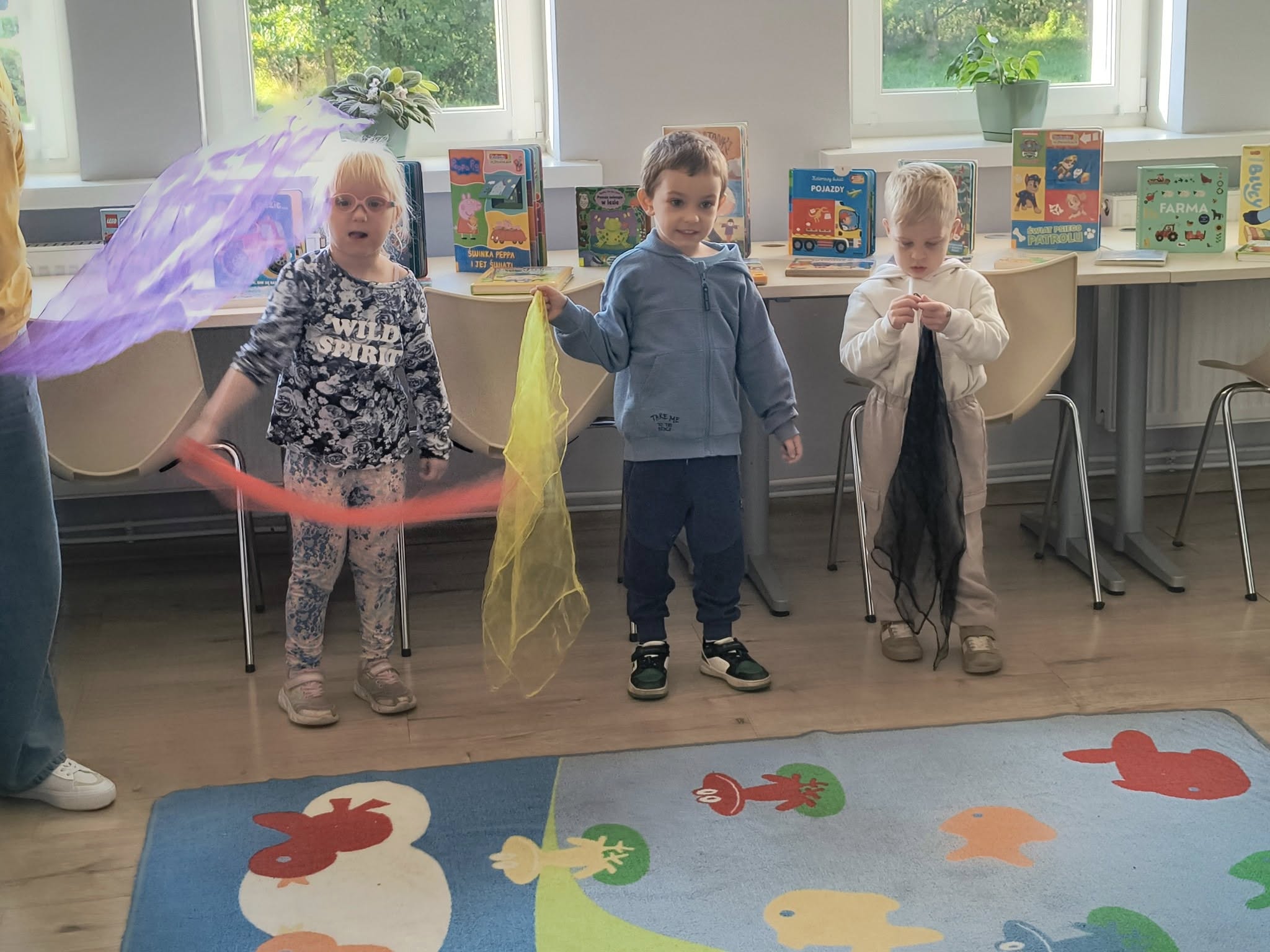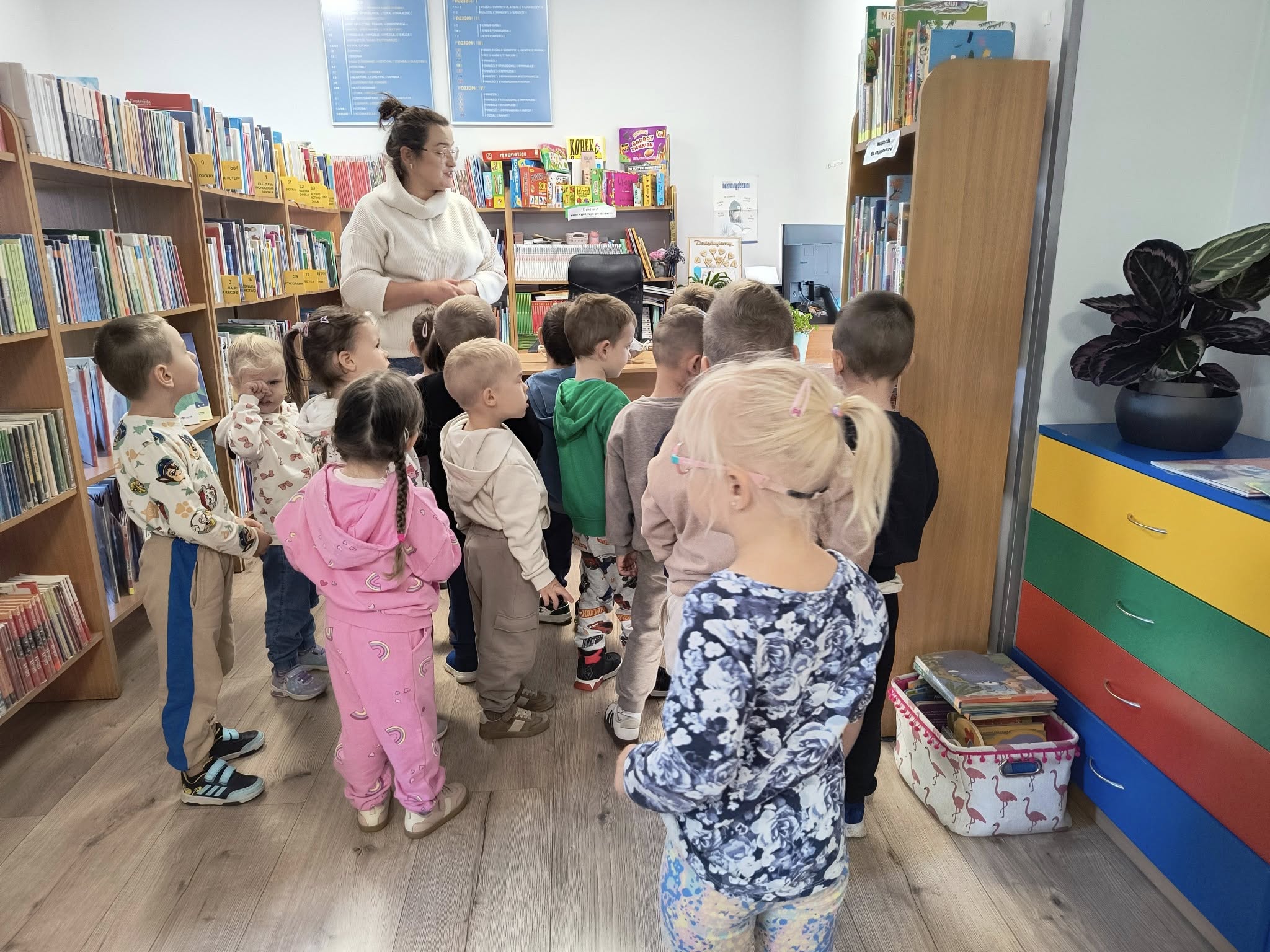 Dzieci słuchały wciągającego opowiadania „Złodziej liści”, a potem bawiły się przy jesiennych zabawachNie zabrakło też kreatywnych zajęć – przedszkolaki wyklejały wiewiórki, ćwicząc zdolności manualneBył to naprawdę miły czas, pełen uśmiechów, kolorowych liści i dobrej zabawy w świecie książek.