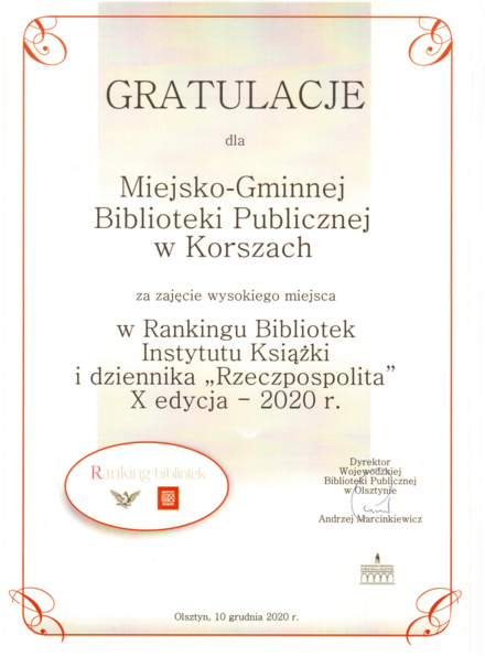 Miejsko-Gminna Biblioteka Publiczna w Korszach znalazła się na 18 miejscu Rankingu Bibliotek 2020 (w 2019 byliśmy na 31 miejscu), na 4 miejscu w województwie warmińsko-mazurskim oraz na miejscu 1 w powiecie kętrzyńskim.