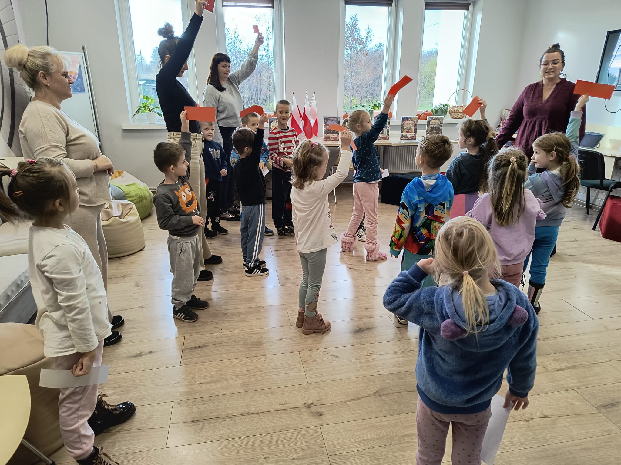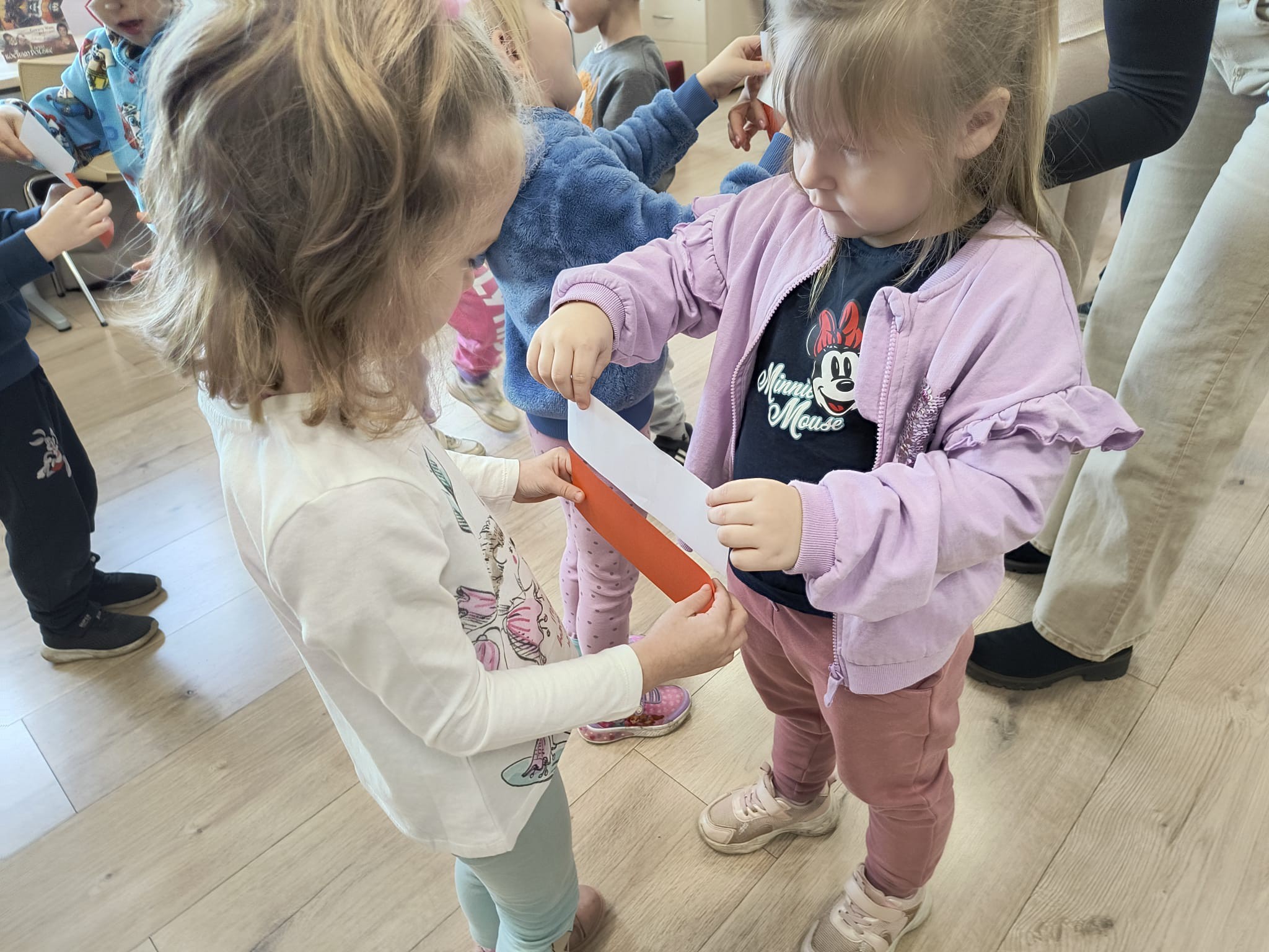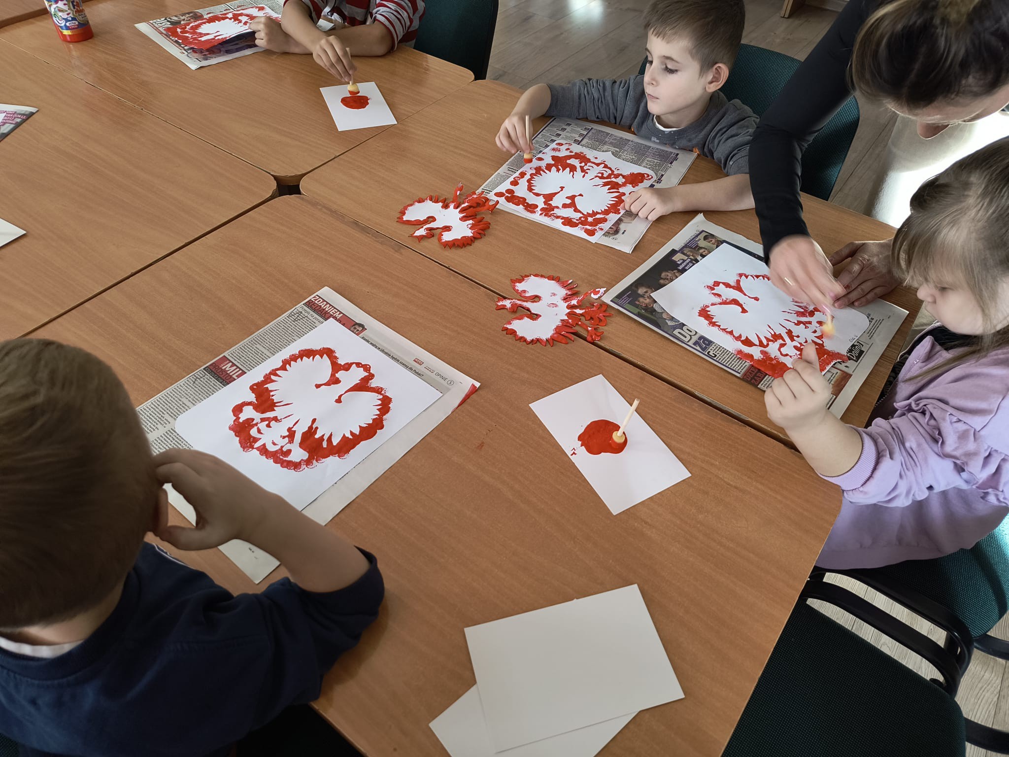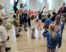 Spotkaliśmy się, aby porozmawiać o Święcie Niepodległości. Przedszkolaki z zainteresowaniem wysłuchały książki o polskich symbolach narodowych i chętnie brały udział w rozmowie. Po tematycznych zabawach wykonały godła Polski.