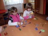 Styropianowe jajka malowaliśmy farbą i zdobiliśmy kolorowymi cekinami, wykorzystując do tego szpilki. Kolory i wzory dobierane były według własnego upodobania i wyobraźni.
