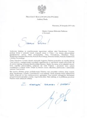 Miejsko-Gminna Biblioteka Publiczna w Korszach otrzymała podziękowanie od Prezydenta Rzeczypospolitej Polskiej Andrzeja Dudy. Prezydent dziękuje również wszystkim osobom, które wsparły akcję Narodowego Czytania i wzięły w niej udział. W podziękowaniu otrzymaliśmy okolicznościowy egzemplarz „Nowel polskich” oraz flagę Rzeczypospolitej Polskiej.