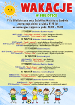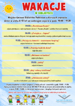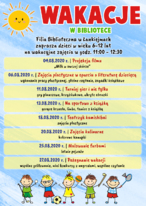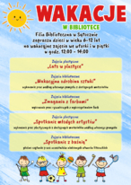 1. Podróże dookoła świata z biblioteką - w programie m.in. historia, ciekawostki, łamigłówki, zajęcia literackie, teatrzyk Kamishibai, zajęcia plastyczne, projekcje filmowe, zajęcia kulinarne, zajęcia ruchowe - dotyczące różnych krajów i pochodzące z różnych krajów.