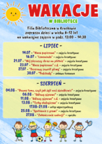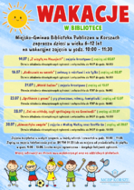 Ze względu na sytuację epidemiologiczną - wszystkie zajęcia na zapisy. Zajęcia będą prowadzone w małych grupach liczących maksymalnie 10 osób. Zapisy prowadzone będą oddzielnie na każdy tydzień wakacji - osobiście lub telefonicznie - od godziny 9:00 - w tygodniu poprzedzającym tydzień, w którym prowadzone będą zajęcia. Do każdego piątku - w tygodniu poprzedzającym zajęcia - należy przekazać do MGBP w Korszach lub filii bibliotecznej (tam gdzie dziecko będzie uczestniczyło w zajęciach) komplet dokumentów (oryginały) związanych z udziałem dziecka w zajęciach (plik do pobrania na dole strony) lub przesłać skan, a oryginały przekazać w dniu zajęć (1. Zgoda rodzica lub opiekuna prawnego na udział w zajęciach z Oświadczeniem RODO oraz 2. Oświadczenie o stanie zdrowia dziecka i odpowiedzialności w warunkach obowiązującego stanu epidemii Covid-19). Wszystkie formularze do pobrania na stronie internetowej biblioteki lub na miejscu. O zakwalifikowaniu się na zajęcia będzie decydowała kolejność zgłoszeń.