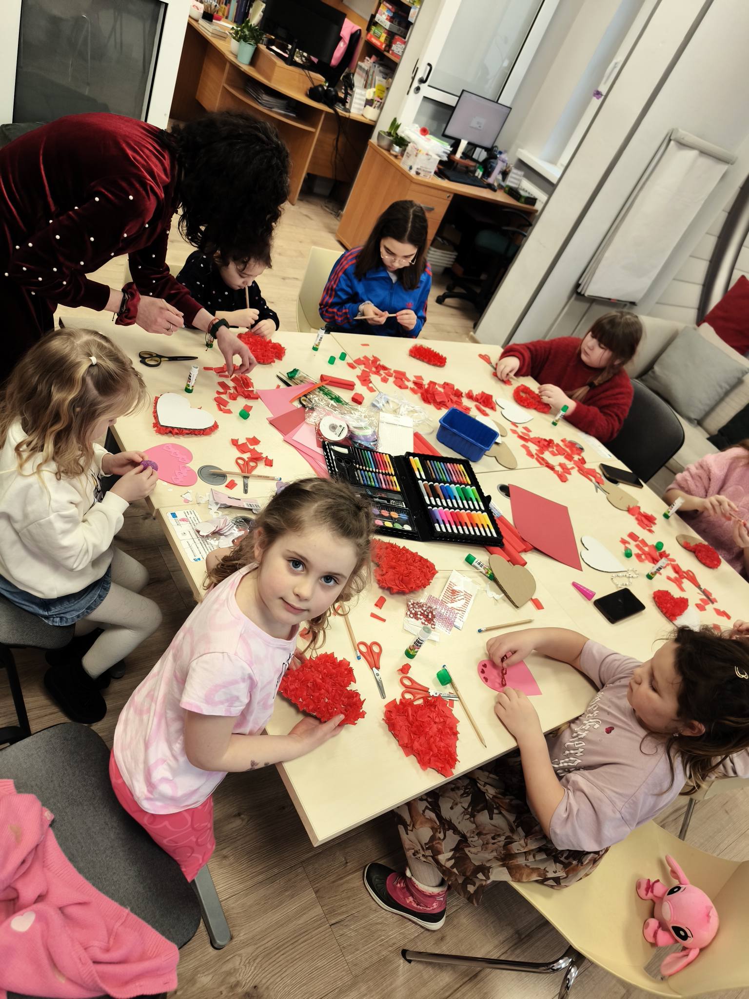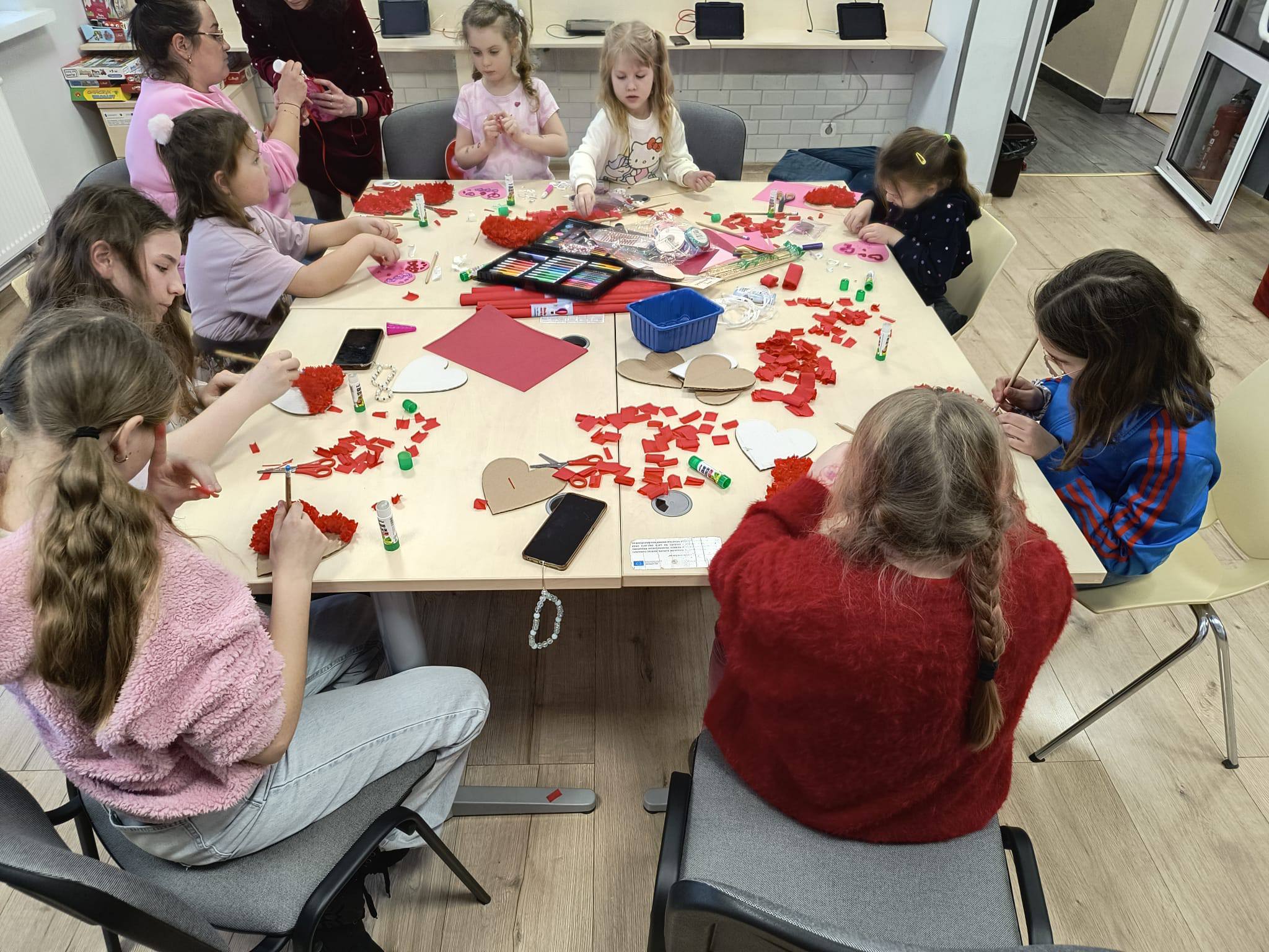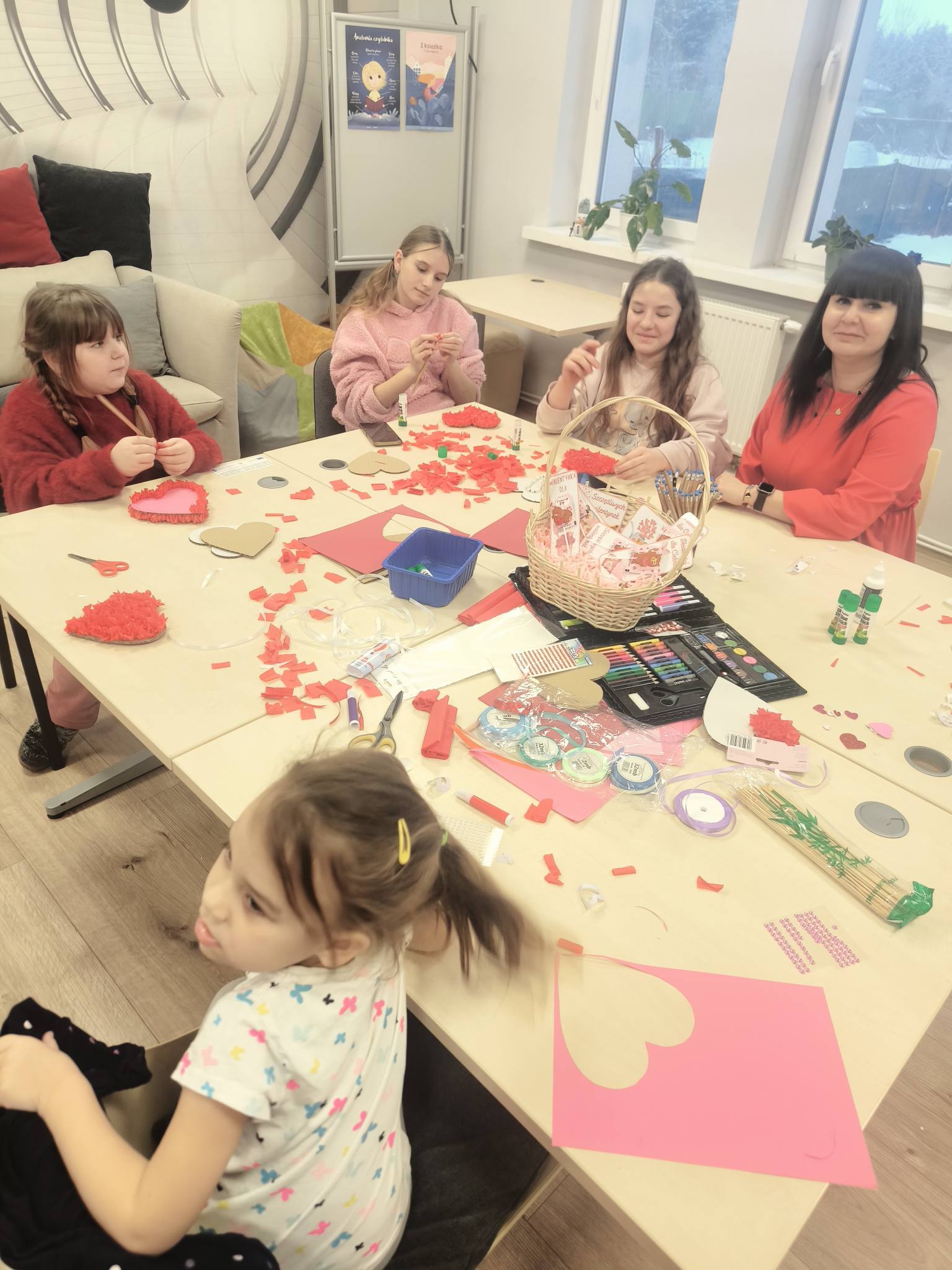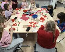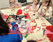 W piątkowe popołudnie dzieci z ogromnym zaangażowaniem tworzyły walentynkowe serca z bibuły. Było wycinanie, klejenie, zwijanie i mnóstwo kreatywnej pracy. Czerwone skrawki bibuły szybko zamieniały się w wyjątkowe, puszyste serduszka. Każda praca była niepowtarzalna i wykonana z wielką starannością.