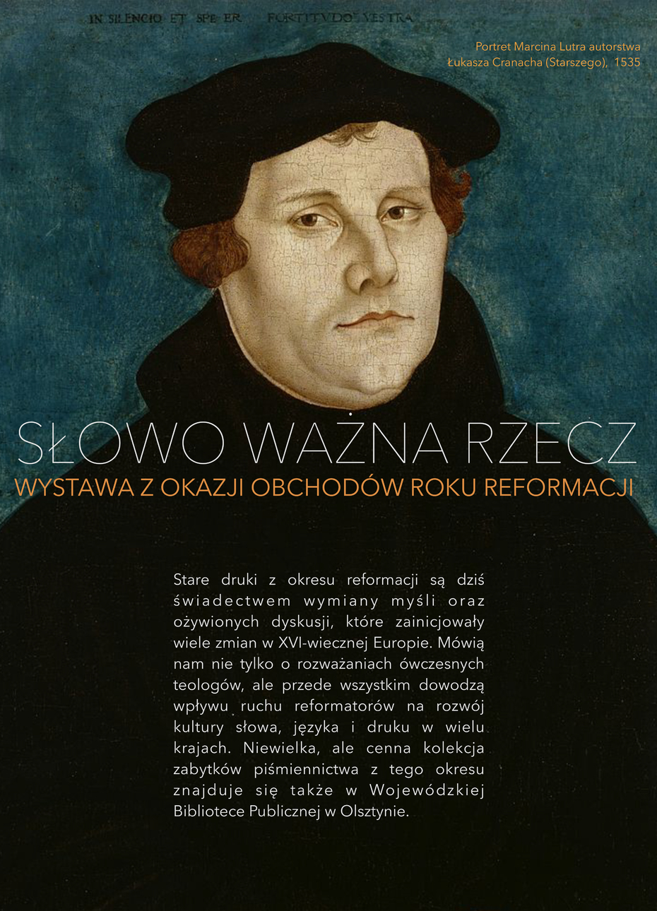 Wystawa prezentuje kolekcję starych druków z okresu reformacji znajdujących się w zasobach Wojewódzkiej Biblioteki Publicznej w Olsztynie.