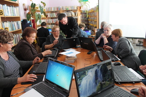 Dnia 8.05. 2014 w bibliotece nowa grupa zajęła miejsce przed laptopami. Panie i panowie ogółem 12 osób weźmie udział w szkoleniu informatycznym. Poznają wybrane zagadnienia z zakresu informacji elektronicznej, obsługi komputera i Internetu.